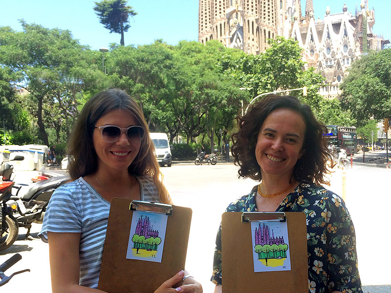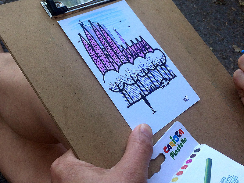 One more option for sketching — drawing Barcelona landmarks on postcards right on location in a jolly free-hand style by permanent markers. This technique makes your drawing on postcard long lasting and brite. Absolutely no experience in sketching necessary! My teaching approach is based on a no-fail process that aims to achieve a perfect result for everyone. You’ll enjoy your picture!