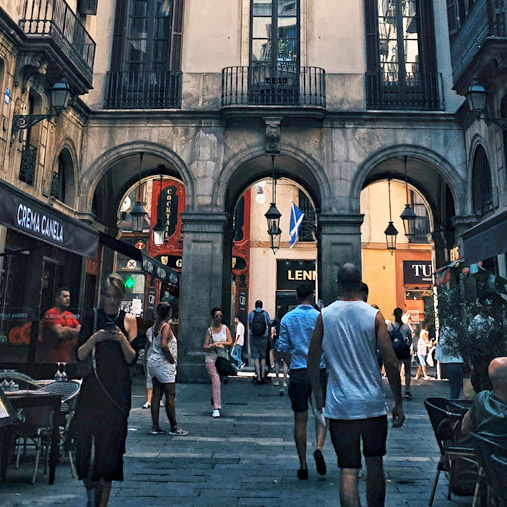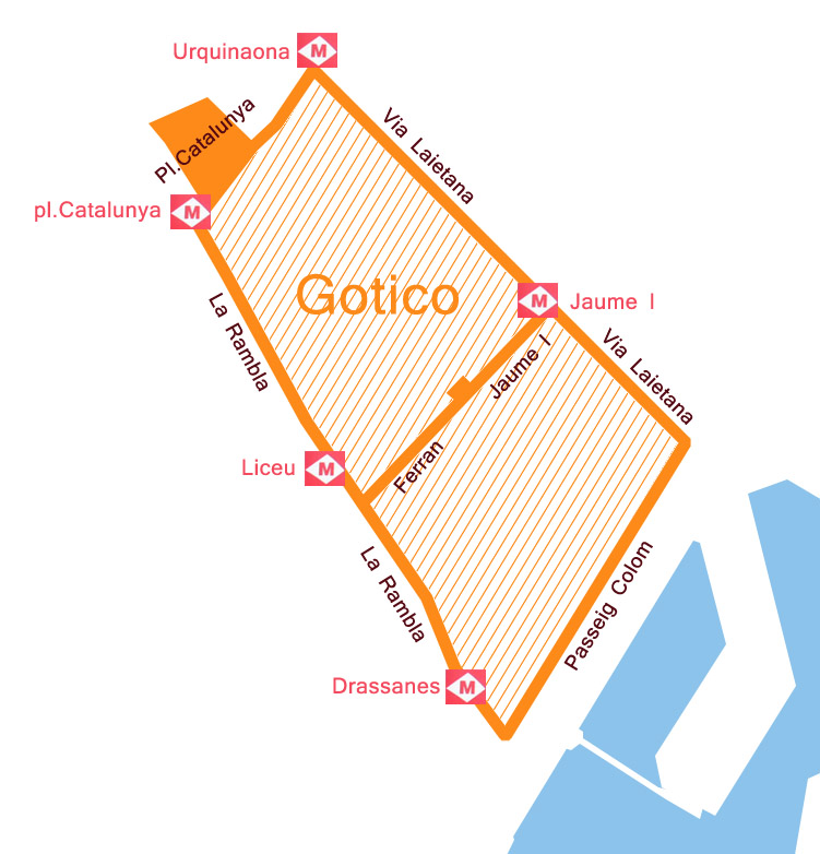 The Gothic Quarter consists of narrow streets. Most of them do not have a division into a sidewalk and a roadway. The most important thing for us is that there is unilateral traffic on all these streets. The only streets in Gothic with bilateral traffic and higher sidewalk are Carrer Ferran and Carrer Jaume I. Carrer is a street in Catalan. Carrer Ferran and Carrer Jaume I go in the same direction, they are actually one street that divides the Gothic Quarter in half. In the middle of the neighborhood, where one street meets the other, there is a small square of Sant Jaume with beautiful government buildings. If you find yourself on one of these streets, you will quickly reach the boundary of the Gothic Quarter, moving along them in any direction you choose. Carrer Jaume I will take you to Via Laetana, a wide street with bilateral traffic. The metro station is located at the intersection of Carrer Jaume I and Via Laetana. Carrer Ferran will take you to the most famous tourist street La Rambla, which means Boulevard. La Rambla is a wide boulevard with bilateral traffic. If you turn from Carrer Ferran on La Rambla to the right, then in a minute you will reach the entrance to the Liseu metro station.